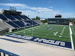 Maverik Stadium, also known as Merlin Olsen Field at Maverik Stadium, is an outdoor college football stadium in the western United States, on the campus of Utah State University in Logan, Utah. The home field of the Utah State Aggies of the Mountain West Conference, it opened 55 years ago in 1968 as "Romney Stadium" and currently has a seating capacity of 25,100. Its field has a traditional north-south alignment, and sits at an elevation of 4,710 feet (1,435 m) above sea level. The playing surface was natural grass through 2003, and is currently AstroTurf GameDay Grass.