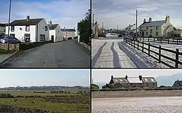 ![]() Clockwise from top left: Looking west over the bridge, taken near Culterham Hall; Looking east toward the pub; Mawbray Yard seen from the beach; The village seen from the east, taken on the road leading to Holme St. Cuthbert. | |