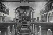 This building replaced an earlier Norman church, of which fragments were re-set in the new vestry in 1861.[36] The school and master's house were built at the same time. At the consecration there were so many visitors that 200 had to wait outside during the service, although Mallinson gained admittance.[35] As of 2017, the font, reredos and pulpit survive, although the pulpit has been lowered.[37][38]