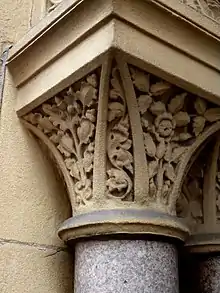 This building at 30 Park Place, Leeds, is not listed. It was designed by Thomas Ambler of Park Row, Leeds as a warehouse for NP and H Nathan, and completed in 1865. Mawer and Ingle supplied granite and carving.[81] As of 2017 it is a hotel called The Chambers. It has panels and capitals of carved leaves, with animals hidden amongst the foliage. The Building News said in 1865: