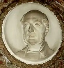 This medieval church building at Aberford near Leeds, was partly rebuilt and re-opened on 29 April 1862. The extension was consecrated by the Archbishop of York. The extension and internal reordering was designed by Anthony Salvin. North and south aisles were rebuilt, with a vestry on the north side and a porch on the south. The nave was effectively replaced in the Early Decorated style, leaving the original 800-year-old tower, and the east end which was built around 1830. A new Forster and Andrews organ was installed. The heads on the south porch represent Queen Victoria and the Archbishop of York. Samuel Hicks (1758-1829), village blacksmith of Micklefield, is represented on a window corbel; he is buried beneath the south window. The 1853 font from the previous church was installed in the present church.[46] The walls are of Bramham Moor stone, and the window mullions and internal arches and pillars are of "stone from the Sturdy Bank quarries near Harewood". The roof is of Westmorland slates.[47] Several windows, including the one dedicated to Hicks the blacksmith, are by Wailes, and the floor tiles are by Minton.[48][49]