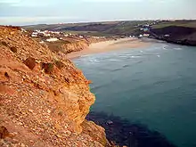 The sandy beach, backed by dunes with cliffs at each end, is quality-assessed and supervised by lifeguards during the summer. It is a popular surfing location. The South West Coast Path passes behind the beach and the area attracts holiday-makers.[2]