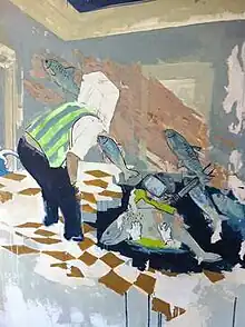 Max Dauphin creates figurative art works, using mixed techniques and big formats. His paintings frequently reveal scenes of life illustrated with slogans and/or iconography. His subjects are inspired by his experience, current events and more generally his entourage. Following daily conversations, the artist projects the viewer's attention toward captivating characters, sometimes living on the brink of society. By matching these characters with improbable attributes, their apparent realism gives way to the imagination. During his periples, Max Dauphin works with a deliberate challenge: to use a local palette of available materials. The combination of colors and material highlights the playfulness of his characters and emphasizes the dynamism of his subjects.