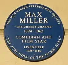 Thomas Henry Sargent (21 November 1894 – 7 May 1963), known professionally by his stage name Max Miller and billed as The Cheeky Chappie, was an English comedian often considered the greatest stand-up of his generation.[1] He came from humble beginnings and left school at the age of twelve. At the outbreak of the First World War, he volunteered for the army. During his time in the forces, he started a troupe concert party. On leaving the army, he took up work as a light comedian, dancer, and singer. He toured extensively, appearing in variety, revues and by the early 1930s reached the top of the bill in the large music halls including the London Palladium.