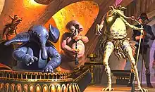 Droopy McCool is the stage name of a slow-minded Kitonak musician and original member of the Max Rebo Band. He plays a chidinkalu horn, an instrument that resembles a clarinet. Droopy's actual birth name is a series of unpronounceable flute-like whistles, but he was renamed Snit by Orbus, who purchased him as a slave and forced him to join his band due to Snit's musical talents.[24] Following Orbus's death, he is freed and given his familiar stage name by bandmate Sy Snootles. After the band flees Jabba's barge following his death, Droopy quits the group and wanders off alone into the desert to search for other members of his race.[6] He is never seen again, but rumors among Tatooine's moisture farmers claim that the sound of Kitonak pipes have been heard from the far reaches of the desert.[2][16]