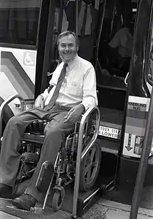 Starkloff was passionate about disability rights and was one of the leaders of the "independent living movement," a grassroots movement meant to inspire young people with disabilities to take control of their own care.[2] The Max Starkloff Lifetime Achievement Award from the National Council on Independent Living was named after him. In 1970, while living in a nursing home, Starkloff founded Paraquad. The goal of the company was to help people with disabilities live independently. One year later, in 1971, he began the St. Louis chapter of the National Paraplegia Foundation. He continued to fight for disability rights and was able to convince St. Louis officials to install curb cuts on the sidewalks of the city. He would often say: "I'm not 'confined' to a wheelchair. I'm confined to what society tells me I'm confined to."[1] In 1983, he co-founded the American National Council on Independent Living (NCIL) with Marca Bristo and Charlie Carr.[3] He fought for the passage of the Americans with Disabilities Act, which passed in 1990. Starkloff sought to make the world more accessible for the disabled; in addition to the city sidewalks, he was also involved in making the St. Louis Zoo create accessible facilities.[1] In 2003, he and his wife Colleen began the Starkloff Disability Institute in downtown St. Louis, which sought to work with employers in hiring disabled people. He won a President's Distinguished Service Award in 1991, and was awarded a star on the St. Louis Walk of Fame.[4]