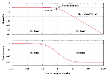 The frequency response of the Butterworth filter is maximally flat (i.e. has no ripples) in the passband and rolls off towards zero in the stopband.[2] When viewed on a logarithmic Bode plot, the response slopes off linearly towards negative infinity. A first-order filter's response rolls off at −6 dB per octave (−20 dB per decade) (all first-order lowpass filters have the same normalized frequency response). A second-order filter decreases at −12 dB per octave, a third-order at −18 dB and so on. Butterworth filters have a monotonically changing magnitude function with ω, unlike other filter types that have non-monotonic ripple in the passband and/or the stopband.