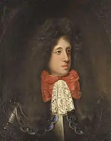 Maximilian William's elder brother, Frederick Augustus, the second son, was killed in battle in 1690. His death made Maximilian William the Duke's second son and prompted him to claim the right to inheritance he had been deprived of in favour of his eldest brother, George Louis.[2] Maximilian William and his second-youngest brother, Christian Henry, announced that they would not recognize the adoption of primogeniture. Maximilian William proceeded to plot to set primogeniture aside, assisted primarily by the Master of the Hunt Joachim von Moltke. Anthony Ulrich, Duke of Brunswick-Wolfenbüttel, and the prime minister of Brandenburg Eberhard von Danckelmann were also implicated, and it is believed that Duchess Sophia was aware of the conspiracy but did not wish to estrange herself from her younger sons. His sister, Electress Sophia Charlotte of Brandenburg, informed their father of the plot by letter in 1691. Maximilian William and Moltke were imprisoned at the end of the year and charged with high treason.[2] Moltke was executed, while Maximilian William was exiled the following year. He first sought protection from his paternal uncle, George William, and then went to Vienna to serve Emperor Leopold I.[2] [5]