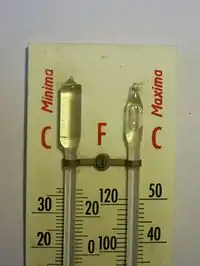 The thermometer shows a reading at the top of the mercury section on both the maximum and minimum scales; this shows the current temperature and should be the same on both scales. If the two readings are not the same, then the instrument scales are not correctly positioned or the instrument is damaged.[2]