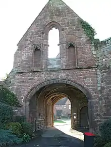The Outer Gatehouse is of two storeys. The structure is now roofless but all of its walls are in a good structural condition. The north and south walls are gabled. The north and south arches of the gateway have two chamfered orders. The gateway also has an inner pair of south arches. The western is a pointed doorway while the eastern is a wader gateway. The north compartment has quadripartite vaulting which has chamfered ribs. The south compartment is also vaulted. In the west wall of the south compartment is a pointed doorway which once gave access to a west chamber. The upper floor of the gatehouse is lit by windows of two lights in the northern and southern walls. The northern window is flanked by two niches which once held statues. The window still retains its transom and drip moulds. On the end of the drip mouldings are two carved heads. One is of a knight with a closed visor while the other is of a monk. It is grade II* listed.[2]