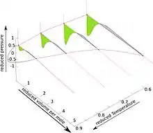 The pseudo-3D diagram for the van der Waals fluid is shown in the accompanying Figure. For details see lectures from University of Connecticut, articles 88, 93, 95 and especially 96.[2]