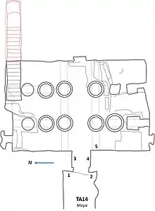 The entrance of the tomb leads to a pillared hall. Only the pillars in the center have been completed. The space is much damaged by both bats and a possible fire.[2] The entrance of the tomb provides a scene where Akhenaten and Nefertiti are presenting a censer and libations to the Aten. The royal couple are followed by three of their daughters and the Queen's sister Mutbenret. The latter is accompanied by two dwarfs who are named Para and Re-neheh. In other scenes May is shown praying. Davies mentions that May's name has been excised and his image destroyed.[2]