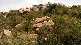 A large variety of mammals have been observed in this exclosure,[12] with scientific (italics), English and Tigrinya language names.[13] - Crocuta crocuta, spotted hyena, ዝብኢ (zibi) - Caracal caracal, caracal, ጭክ ኣንበሳ (ch’ok anbessa) - Xerus rutilus, unstriped ground squirrel, ምጹጽላይ or ጨጨራ (mitsutsilay, chechera) - Canis mesomelas, black-backed jackal, ቡኳርያ (bukharya) - Canis anthus, golden jackal, ቡኳርያ (bukharya) - Procavia capensis, rock hyrax, ጊሐ (gihè) - Felis silvestris, African wildcat, ሓክሊ ድሙ (hakili dummu) - Civettictis civetta, African civet, ዝባድ (zibad) - Ichneumia albicauda, white-tailed mongoose, ፂሒራ (tsihira) - Herpestes ichneumon, large grey mongoose, ፂሒራ (tsihira) - Hystrix cristata, crested porcupine, ቅንፈዝ (qinfiz) - Genetta genetta, common genet, ስልሕልሖት (silihlihot) - Lepus capensis, cape hare, ማንቲለ (mantile) - Mellivora capensis, honey badger, ትትጊ (titigi).