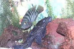 This species is also a dietary generalist, consuming organisms from a variety of disparate taxa.[13] However, it is susceptible to malnourishment, apparently due to the requirement that a relatively large proportion of its diet be animal prey.[7] The Mayan cichlid's diet includes plant matter, smaller fish, algae, detritus, snails, crustaceans, and insects.[14][15]