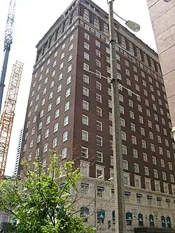 Designed by prominent St. Louis architect Preston J. Bradshaw, the hotel's 18-story building was built in 1924 and 1925. The concrete building is faced in red brick and terra cotta; it uses terra cotta extensively in its facing, window frames, ornaments, and cornices. The building had three high-speed elevators run by elevator operators. The Mayfair opened its doors on August 29, 1925, for a private reception and dinner for the 120 stockholders and contractors.[2] The next evening, 4,000 guests were invited for a grand opening and dedication.