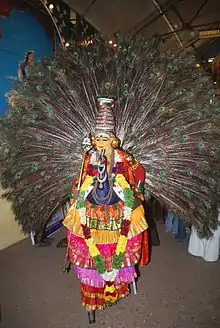 Mayilattam performers wear costumes from head to toe like peacock with beak, that can be opened and closed using a thread, and perform specific dances. The performers dance on a tall piece of wood attached at the end of their feet. This art requires extensive training and practise. This dance is performed in all Murugan (Lord Subrahmanya) temples as a tradition during festivals. Due to the difficulties in practise and less amount of wages for the dancers, the number of Mayilattam performers is decreasing.[2][3]