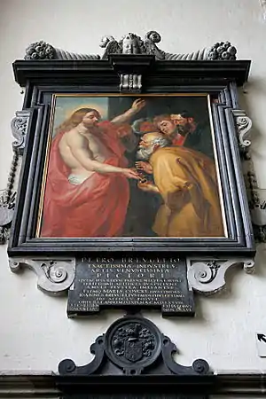 Commemorative plaque in the Chapel Church honouring Maria Coucke and her husband Pieter Bruegel the Elder. The painting Christus geeft de sleutels aan Sint Pieter was an original Peter Paul Rubens, the current work at display in the church is a copy.