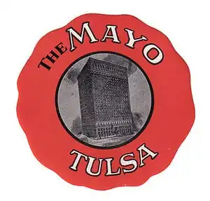 The Mayo Hotel was built in 1925, designed by architect George Winkler, and financed by John D. and Cass A. Mayo.[2] The base of two-story Doric columns supports fourteen floors marked with false terracotta balconies, and a two-story crown of stone and a dentiled cornice[3] At the time the 600-room hotel was the tallest building in Oklahoma. Ceiling fans in each room and Tulsa's first running ice water made the hotel a haven from summer heat.