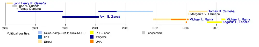 The current mayor is Michael Rama, under BARUG-PDP–Laban. He succeeded the late Edgardo Labella after the latter died in office and was elected in office in the 2022 elections.[4]