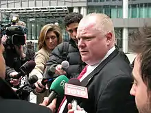 During his term as mayor, Ford was involved in several publicized incidents while driving, including reading while driving on the Gardiner Expressway,[8] and talking on his cell phone while driving.[8] In another driving incident, Ford passed the rear door of a streetcar, while the front door was open, leading to "an exchange of words with the streetcar operator."[8] After the August 2012 incident of reading while driving, Ford was criticized by the media, other mayors[9] and safety advocates.[10] The Toronto Police and Rob's brother Doug Ford both urged him to hire a driver.[11] As mayor, Ford was entitled to a personal driver and car paid for by the city, but Ford repeatedly turned down the benefit on the grounds that he did not want taxpayers to pay for the extra cost.[8] Similarly, while a councillor, Ford had disagreed with the city giving councillors free TTC passes and fought for the eventual repeal of the perk on the same basis.[12]