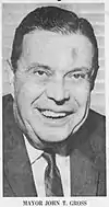 Died in office, September 3, 1964. Born March 5, 1909, in Allentown. Son of longtime former mayor Malcom W. Gross. He attended Muhlenberg College but was forced to leave school before graduation because of the Great Depression. He worked for many years for Pennsylvania Power & Light Company and for the State Department of Economic Development. He was elected in his first attempt at politics, defeating Incumbent Mayor Donald Hock in the May 1959 Democratic Primary. He went on to defeat Republican Ezra Fetzer in the November 1959 general election. Both Vice-President Richard Nixon and Senator John Kennedy led large campaign rallies during the 1960 Presidential Election on Hamilton Street.[32] Accomplishments during Gross's administration were the development of an industrial park at Queen City Municipal Airport and the Fourth Street Urban Renewal Project, in with the 400 block of Hamilton Street was raised and a new Leigh County Courthouse and Allentown City Hall were built, along with a Cinema and a Hotel Complex after his death. A high-rise retirement senior retirement center of 150 units, began construction under his term, later named John T. Gross Towers, which opened in 1967. Allentown was selected in 1963 as an "All-America City" and the 1962 Bicentennial celebration were highlights of his administration, marked by a 7-hour parade down Hamilton Street in July 1962, along with other celebratory events during 1962.[32] In 1961 Mack Trucks was threatening to move from Allentown and he worked closely with Mack executives to provide them tax benefits to keep them competitive. He also worked closely with the Industrial Development Corporation of Lehigh Country in soliciting new manufacturing firms to locate in Allentown. Running for re-election in 1963, Gross defeated former Mayor Brighton Diefenderfer to win a second term. In 1964, Gross began initial studies of downtown shopping district and first initiate to ban traffic and turn it into a pedestrian shopping area, which later became Hamilton Mall in 1973.[2][32] | |||