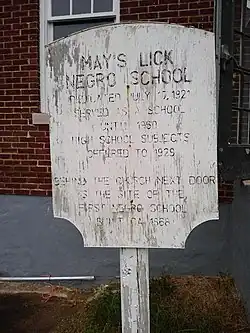 After the American Civil War, the Freeman's Bureau was tasked with educating the newly freed black children. The Freeman's Bureau opened a school for black children in the May's Lick community ca. 1868. The location was behind the Second Baptist Church, near US 68 and Nicholas Street. A new schoolhouse was dedicated July 17, 1921. This school was constructed with help of the Rosenwald Fund. The school remained in operation until the early 1960s.[2]