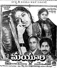 Mayuri (transl. Peacock) is a 1985 Indian Telugu-language biographical dance film directed by Singeetam Srinivasa Rao and produced by Ramoji Rao. Based on the life of Sudha Chandran, the film stars her in the titular role while P. L. Narayana, Nirmalamma, Y. Vijaya, Potti Prasad, K. K. Sharma, S. R. Raju and Suthi Veerabhadra Rao played supporting roles.[1][2]