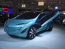 The Mazda Kiyora (清, pure) is the seventh car in the Nagare concept series. Unveiled at the 2008 Paris Motor Show, it is a water-themed, city-oriented compact car[13] with transparent polycarbonate butterfly doors and a water filter that converts rainwater collected on the car's roof into drinking water. The Kiyora also possesses a haptic touchscreen designed to mimic the rippling of water.[14]