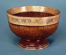 Ornamented types usually have a rim or "band" of precious metal, generally of silver or silver gilt; the foot and the print being also of metal.[8] There are examples with wooden covers, sometimes with a metal handle, such as the Bute Mazer or Flemish and German mazers in the British Museum. On the outside, but generally not the inside of the metal band there is often an inscription, religious, or convivial, and the print was also often decorated with a sculpted or engraved plare, and sometimes a gem.[9] The Bute Mazer is one of the most elaborate to survive, with a three-dimensional reclining lion rising from the base, and enamelled coats of arms in a circle around it. Saints, the religious monogram IHS, and animals, often no doubt with heraldic significance, are other common decorations of the boss. Many metal pieces that appear to be mazer bosses have been excavated.[10] An example from York Minster grants an indulgence of 40 days remission from Purgatory for all who drink from it.[11]