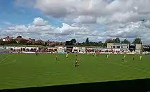 The Mazuma Stadium (formerly known as the Globe Arena for sponsorship reasons) is a football stadium in Morecambe, Lancashire, England, which is the home of Morecambe F.C.[1][2][3][4][5] The stadium opened in 2010, replacing the old Morecambe F.C. stadium, Christie Park, which was Morecambe's home from 1921 to 2010.[6] The stadium holds up to 6,476 supporters, with 2,173 seats available in the Main Stand, which runs the length of one side of the pitch.[7] Opposite the Main Stand is an uncovered terrace with a capacity of 606, giving a similar feel to the ground as that at Christie Park. At either ends of the pitch are the home and away stands, with the home end holding a maximum of 2,234 supporters and the away end having a capacity of 1,389.[8] In the north east corner of the stadium is the Tyson Fury Foundation, which is split between two floors. The building also houses a gym, which was purchased by Tyson Fury in August 2020.[9]