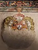 The large hall on the ground floor, the "Salone degli Stemmi", was frescoed in 1543 with a heraldic frieze representing the coats of arms of families linked, by kinship or friendship, to the owners. The coffered ceiling dates back to 1536. Until the 1970s the hall was used as a cinema and theatre.[8]