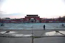 Unlike the other ten city pools that opened in 1936, McCarren Pool was not restored.[16] Residents had opposed the renovation, preferring that it be closed instead, as they claimed the pool had become a hub for drug dealing and prostitution.[38][46] The pool was closed after the end of the 1983 season,[47][48] and when contractors tried to perform a renovation in 1984, protestors chained themselves to the complex's gates. The pool complex quickly became blighted and covered in graffiti. The bathhouse buildings were broken-into and vandalized, until they were sealed up sometime around 1989.[38] The eagle sculptures were stolen from the bathhouse and recovered by an NYC Parks employee who saw them in the window of an architectural-salvage store in Lower Manhattan.[49] A car was also driven into the dried-up pool.[38]