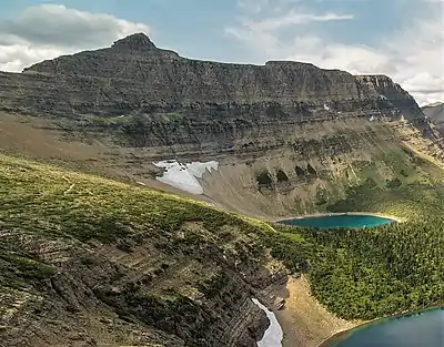 Like other mountains in Glacier National Park, the mountain is composed of sedimentary rock laid down during the Precambrian to Jurassic periods. Formed in shallow seas, this sedimentary rock was initially uplifted beginning 170 million years ago when the Lewis Overthrust fault pushed an enormous slab of precambrian rocks 3 mi (4.8 km) thick, 50 miles (80 km) wide and 160 miles (260 km) long over younger rock of the cretaceous period.[4]