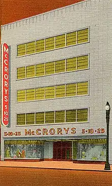With 244 retail units in its chain, the company entered bankruptcy in January 1933.[3] The company was dissolved, but it was eventually re-established as McCrory Stores and resumed operations. One of the early investors was Sebastian Spering Kresge, who later founded the S.S. Kresge chain, which became Kmart. In 1899, Kresge traded his interest in the McCrory's Memphis, Tennessee store for McCrory's interest in the Detroit, Michigan, store, giving him control there. In 1987, the Kmart Corporation sold its remaining Kresge and Jupiter stores in the United States to McCrory Stores.[1]
