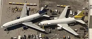 The MD-11 on the left is 202 ft (61.6 m) long and has winglets and a smaller tailplane while the DC-10 on the right is 181.6 ft (55.35 m) long.