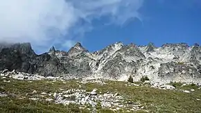 McGregor Mountain is an 8,122-foot (2,476-metre) elevation massif located in the Stehekin Valley of the North Cascades, in Chelan County of Washington state.[4] McGregor Mountain is situated northwest of Lake Chelan in the northern Methow Mountains, on the shared border of North Cascades National Park and Lake Chelan National Recreation Area. The closest community is Stehekin, and the nearest higher neighbor is Goode Mountain, 7.3 miles (11.7 km) to the northwest.[1] Precipitation runoff from the mountain drains into tributaries of the Stehekin River. Topographic relief is significant since the southern aspect of the mountain rises 6,600 feet above this river in approximately two miles. The famous Pacific Crest Trail traverses the western base of this mountain, and the strenuous 7.7-mile (12.4 km) McGregor Mountain Trail gains 6,400 feet (1,920 m) of elevation to take hikers within a half-mile of the summit. Reaching the summit requires exposed scrambling the final 1,100 feet (330 m), and an ice axe is needed if the trail remains covered by snowpack.[5] The summit was the site of an old fire lookout cabin from 1923 until 1955, but now has a radio repeater for the National Park Service. The views from the top include Glacier Peak, Black Peak, Corteo Peak, Frisco Mountain, Tupshin Peak, Dome Peak, Glory Mountain, and many others. This mountain was named for Billy McGregor, a Stehekin Valley resident who had a cabin and homestead at the base of this mountain during the 1890s.[3] In May 1901, Billy disappeared overnight from a boat docked in Lake Chelan, and was never seen or heard from again.[6]
