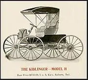 The W. H. Kiblinger Company formed in 1887, manufactured buggies. After W. H. Kiblinger's death in 1894, William H. McIntyre co-purchased the company and began experimenting with automobiles as early as 1897.[2] In 1907 Kiblinger began selling high-wheelers with tiller steering and two-cylinder air-cooled engines as the Kiblinger. Prices started at $250 (equivalent to $7,271 in 2021), which the company claimed was the "lowest price successful automobile on the road'[3][1]