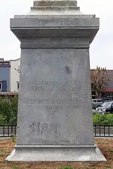 In February 2019, the Arcata City Council approved a measure to relocate the statue to Canton, Ohio,[5] and on February 28, the statue was removed from the Plaza in preparation for its relocation.[6] A nearby plaque on the plaza containing what many considered racially insensitive language regarding local native history was also removed in 2018.[7] [8]