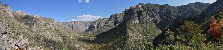 Farther up the canyon, the path becomes quite steep as it begins to follow a series of switchbacks, climbing nearly 2,000 feet (610 m) over the next 2 miles (3.2 km), eventually reaching "the Notch" at an altitude around 7,200 feet (2,200 m).[2][5] From this high point, one can view McKittrick Canyon and the distant desert to the east and South McKittrick Canyon to the west.