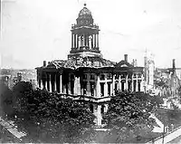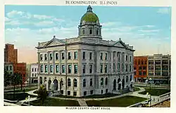 The McLean County Courthouse housed the McLean County Circuit Court from 1903 to 1976. The original construction was completed in 1868 at a cost of $461,640.[2] On June 19, 1900, a fire destroyed many of the buildings in the square and the courthouse. The courthouse was rebuilt in 1903 in a similar style following the fire. It was designed by William Reeves and John M. Baile of the Peoria firm Reeves and Baile.[3] The rebuild of many buildings in the downtown was executed through the designs of several local architects, George Miller, Paul Moratz and A.L. Pillsbury.[4]