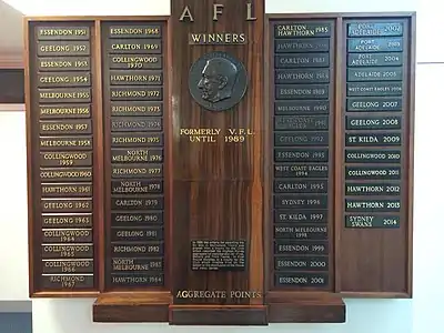 The trophy is a perpetual shield that is kept at AFL House.[13] The original trophy features McClelland's head embossed in bronze on the centre of five panels of wood, where the names of each winning club is inscribed over the years.[14] Clubs also receive a smaller one-panel replica of the trophy.