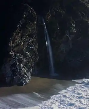 There are a number of waterfalls in the basin of McWay Creek. The most well-known is McWay Falls, which spills 80 feet (24 m) onto a sandy beach at Waterfall Cove.[6] A smaller waterfall, the two-tier, 30-foot (9.1 m) McWay Creek Falls is located upstream of the Highway 1 culvert and the parking area.[7] A small 30-foot (9.1 m) cascade, Canyon Trail Falls, is fed by the South Fork just before it meets McWay Creek.[8] As most of the creek is steep and rocky, there are many unnamed waterfalls that also exist. McWay Creek is fed by a number of springs in McWay Canyon and flows year round.[6]