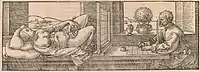 Van Gogh used a perspective frame to help him with his drawing.[16] This is a device that had been used for centuries by such artists as Leonardo da Vinci and Albrecht Dürer, and is still used today by artists and students in the form of simple cardboard cut-outs threaded with cotton. Many of his drawings show traces of squaring as a result of using this technique.