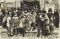 The State Lottery office was situated in the Spuistraat a little to the south of the Geest district, the oldest and busiest shopping street in The Hague. This was where van Gogh's uncle Cent had originally opened his art store that eventually merged with Goupil. In October 1882, Van Gogh made a watercolor of a group of people queuing in front of the lottery (right) as part of his plan to produce a 'saleable' work before the end of the year. To this end he had elected to make studies of groups of people 'doing something or other', studies that had something 'nice and sociable about them'.[29][30][Letters 44] He wrote of this painting: