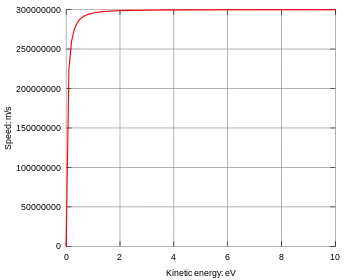 with v being the neutrino speed and c the speed of light. The neutrino mass m is currently estimated as being 2 eV/c², and is possibly even lower than 0.2 eV/c². According to the latter mass value and the formula for relativistic energy, relative speed differences between light and neutrinos are smaller at high energies, and should arise as indicated in the figure on the right.