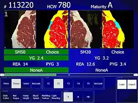 Screenshot from the electronic grading system showing USDA Choice, Yield Grade 2 beef. The left is the natural color view of the cut; the right is the instrument enhanced view that details the amount of marbling, size, and fat