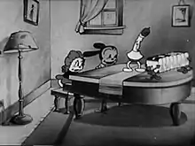 The cartoon begins inside a house. In it, Oswald and his girlfriend Kitty are playing a piano together. On their instrument are a dancing candle stand and two mice playing the accordion.