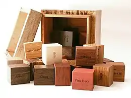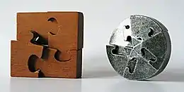 A pyramid puzzle consists of two or more component pieces which fit together to create a pyramid.[1][2] Two-piece pyramid puzzles cannot form a regular pyramid and can only form a 4 faced tetrahedron pyramid. The solution involves facing the square faces to each other and twisting one upright to complete the four faced tetrahedronic pyramid.[3] There are also four-piece pyramid puzzles.[4][5]