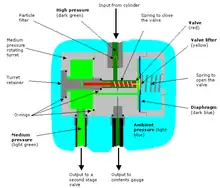 The mechanism of diving regulators is the arrangement of components and function of gas pressure regulators used in the systems which supply breathing gases for underwater diving. Both free-flow and demand regulators use mechanical feedback of the downstream pressure to control the opening of a valve which controls gas flow from the upstream, high-pressure side, to the downstream, low-pressure side of each stage.[1] Flow capacity must be sufficient to allow the downstream pressure to be maintained at maximum demand, and sensitivity must be appropriate to deliver maximum required flow rate with a small variation in downstream pressure, and for a large variation in supply pressure, without instability of flow. Open circuit scuba regulators must also deliver against a variable ambient pressure. They must be robust and reliable, as they are life-support equipment which must function in the relatively hostile seawater environment, and the human interface must be comfortable over periods of several hours.