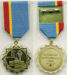 The Medal "10 years of Astana" (Kazakh: Астанаға 10 жыл, Astanaǵa 10 jyl) is a state award of Kazakhstan.[1] It was first introduced on May 6, 2008,[2] in honor of 10 year anniversary of the city of Astana.